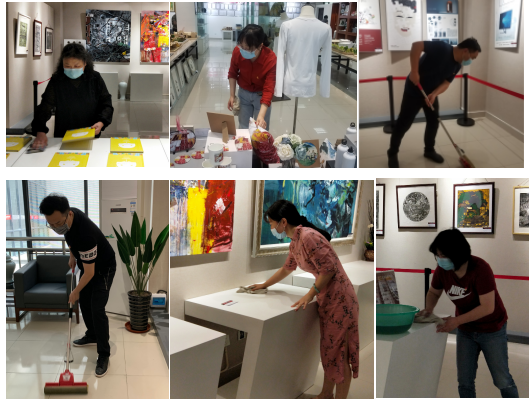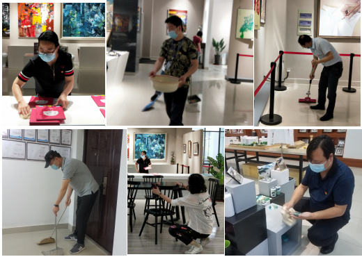 活动中,党员老师和员工们积极热情,分工合作。大家各自拿着扫帚、抹布等清洁工具,对艺术楼一楼展厅、技法教室、三楼会议室进行了打扫清理,对员工作品陈列室和漆艺陶艺工作室认真整理归置,大家齐心协力保质保量地完成了自己的工作。通过本次主题党日活动,展厅、陈列室和会议室内部环境卫生得了改变,室内干净整洁、作品有序、摆放到位,为返校毕业生提供安全、卫生、舒适的创作环境。