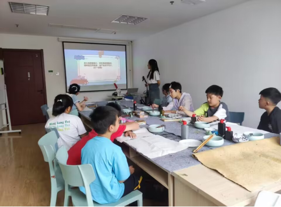 中国画,是用毛笔、墨和中国画颜料在特制地宣纸或绢上作画,题材主要有人物、山水、花鸟,技法可分工笔和写意两种,富于传统特色,其中写意画可分为小写意画和大写意画。公益课堂结合青少年活动中心员工的实际情况,安排了一系列的主题课程,每个主题课程从作品赏析、握笔、用墨调色和线条的用法等方面给孩子们讲解国画的基础知识,再从国画的表现形式、颜色的浓淡变化等方面一步步引导孩子们动手绘画,由一名主讲老师和多名助教老师共同完成。