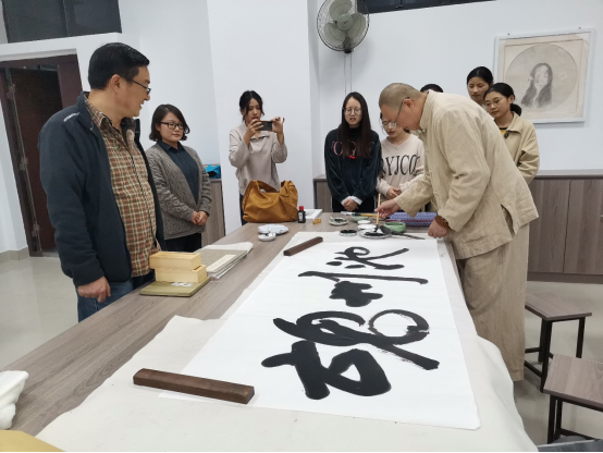 在艺术楼一楼书法教室,徐先生与公司书画爱好者进行了艺术交流指导,为同学们指导作品,解答同学们学习书画过程中遇到的困惑和难题,并现场挥笔泼墨,为公司题词,向大家展示中国书法艺术的魅力。
