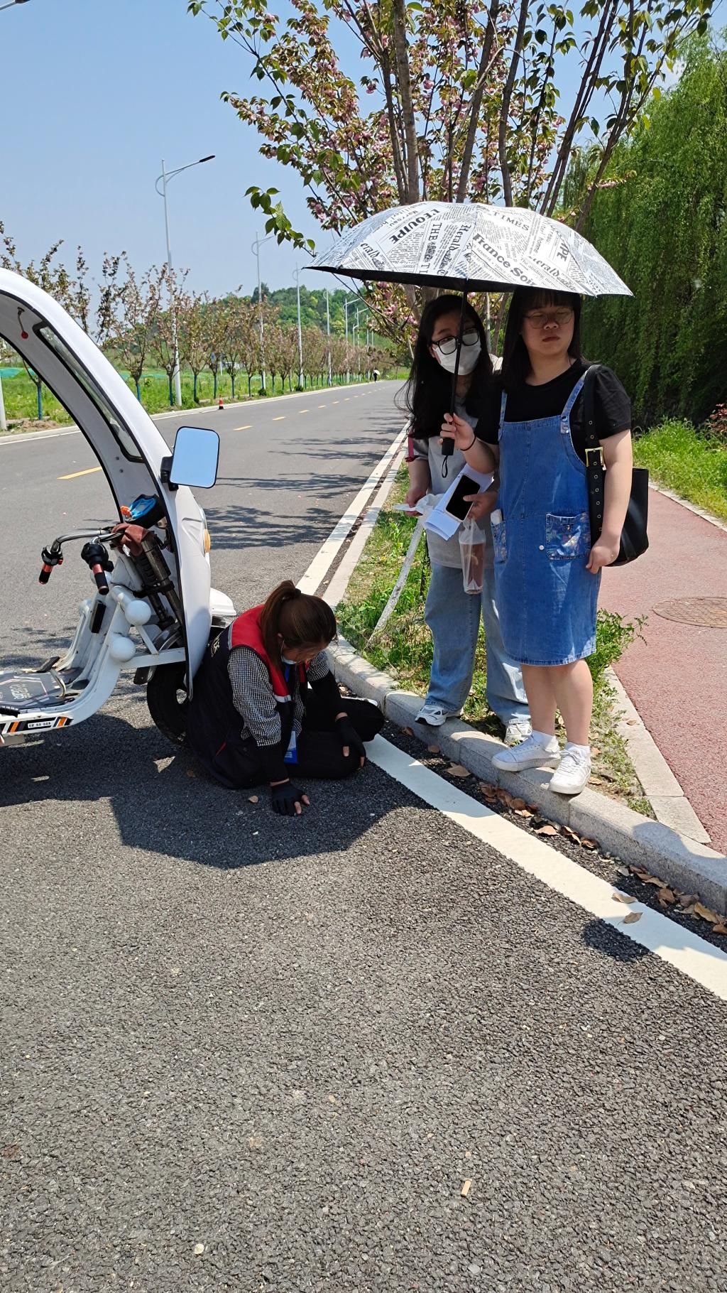 4月11日中午,在公司樱花大道,一辆外卖配送车在行驶过程中与一辆小轿车相撞,导致外卖配送员从车内跌出。外卖配送员摔倒在地上,一时之间不能够动弹,无法起身,且身上有多处擦伤。此时,蔡晴瑶和叶丽君两位同学恰好经过此处,见此情形,两人上前热心询问该外卖员是否需要帮助,并且为外卖员撑伞遮挡烈日,直至负责人到场、确认救护车即将到达后方才离开现场。