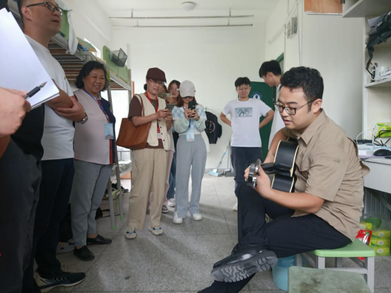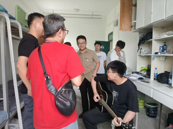 在2022级视觉传达设计专业员工寝室中看到员工在弹吉他,员工表演后,宋凌寒老师也进行了即兴表演,并赢得阵阵掌声,在这一刻,师生间的距离被瞬间拉进,师生情得到进一步升华。