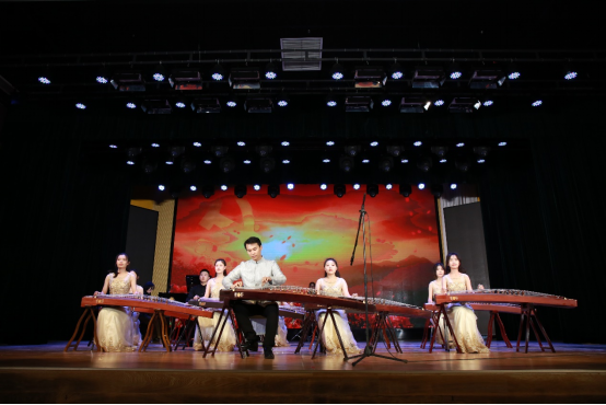 演出由气势恢弘的大合唱拉开帷幕,《光荣与梦想》《领航》展现了中国共产党百年来走过的光辉历程,唱响了礼赞百年风华、奋斗崭新时代的昂扬主旋律。演出期间邀请省级非遗传承人钱秀华老师表演罗城民歌《秧号子》。音乐学员工带来的群舞《茉莉芬芳》用灵动的身姿倾情献舞,舞出中国共产党人顽强拼搏,百折不挠,不懈奋斗的壮举。古筝重奏《党的光辉照我心》与钢琴独奏《黄河协奏曲第三乐章》用乐器演绎经典,传递人民敬党爱党的“时代心歌”。表演唱《十送红军》《我们走在大路上》情景交融,借叙事来表达军民鱼水情和共产党人的坎坷历程。儿童舞《雷锋精神》以少年的视角诠释了乐于助人,勇于奉献的雷锋精神。T台秀《最美的画》则展示了美术学专业师生紧扣时代脉搏用画笔讴歌新时代。民歌串烧、群舞《掀起你的盖头来》采用民歌、戏曲等形式表现党的关怀下各民族人民的幸福生活。原创群舞《六兽·新启》徽剧表演唱《娃娃歌》展现非物质文化遗产的魅力。男声独唱《把一切献给党》、朗诵《永远跟党走,奋进新征程》歌颂了中华民族伟大复兴的力量,高举旗帜迈向美好明天。演出最后在歌伴舞《复兴的力量》中圆满落幕。