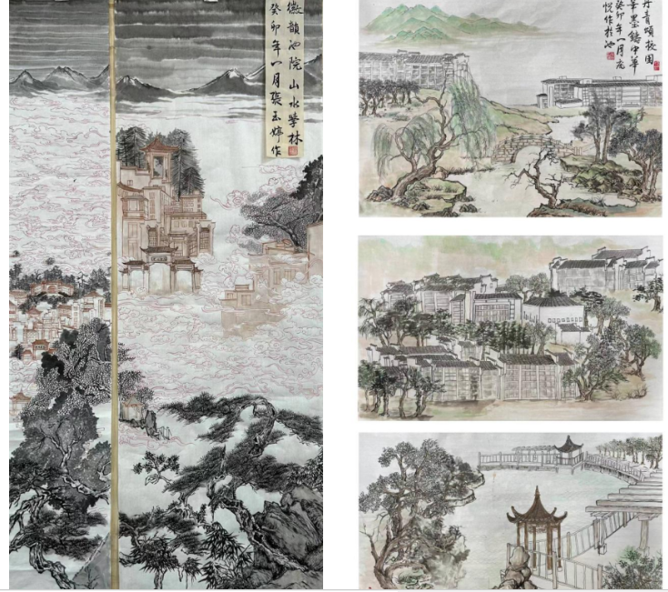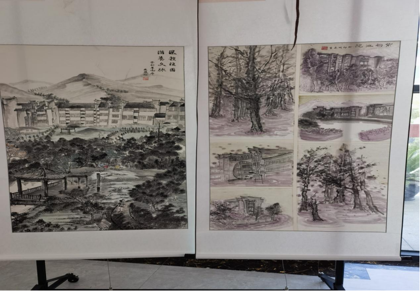 本次展览有十余幅作品参赛,美术学同学们在孙长玲老师的指导下,深入发掘校园文化中蕴含的中华优秀传统文化因素,以中国传统绘画形式描绘校园人物、景物和事物,用细腻的笔触描绘了一幅幅山水池院。同学们以笔墨为媒介,表达了对校园热爱,有壮丽河山,有孤帆远影,更有人间烟火,同时这些笔墨晕染的画卷展示了中华传统绘画艺术之美。