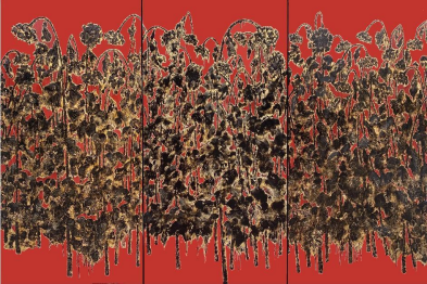作品《满江红—1》采用了写意的创作手法,画面具有强烈的节奏感、神韵感。采用贴金银箔罩透明等综合技法表现出了向日葵的逆光效果。在凸显血气与方刚的朱红色背景之下,在金色光辉之中,向日葵们互相依靠、扶持,昂首挺胸矗立在广袤的大地之上,表达出了一种敢于攻坚克难且积极乐观的生活态度。