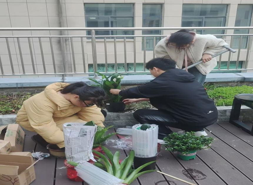 同学们挽起衣袖、挥锹铲土、扶苗填坑、培土浇水,合力栽下一株株树苗,齐心造就未来的春色。在全体成员一番辛勤劳作下,一盆盆绿植迎风挺立,为艺术楼增添了勃勃生机。