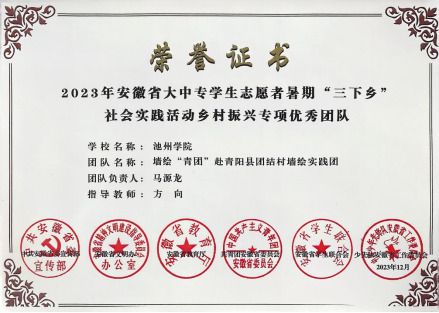 经过团队的共同努力和辛勤付出,威廉体育williamhill“墙绘青团”暑期社会实践团队在2023年底传来了喜讯——荣获2023年安徽省大中专员工志愿者暑期“三下乡”社会实践活动乡村振兴专项优秀团队荣誉称号。这一荣誉不仅是对实践团成员们辛勤付出的肯定,更是对威廉体育williamhill在推进乡村振兴战略中积极贡献的认可。