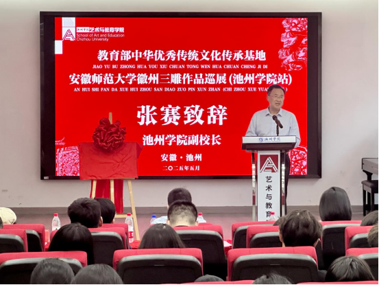 仪式上,张赛与朱琳共同为实践基地揭牌。揭牌仪式结束后,与会代表共同观摩了60余件徽州三雕巡展作品。