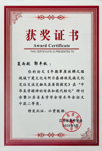 公司青年教师夏雨航受邀参会,并在年会中口头汇报论文《早期草原丝绸之路视域下楚文化与阿尔泰游牧民族文化交往交流交融及其原因探究》,获征文二等奖。此次获奖,彰显了公司在鼓励学术创新、推动跨学科融合发展的积极成效。公司将继续支持教师投身前沿学术探索,为传承与弘扬中华优秀传统文化,推动其创造性转化与创新性发展贡献智慧和力量。
