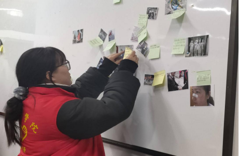 本次活动开始由负责人向大家阐述了2020疫情、洪涝、地震等灾害中冲锋在前线的英雄战士、志愿者以及劳动者身上的奉献精神并鼓励志愿者们积极学习。接下来志愿者们共同观看抗击疫情先进代表事迹的相关纪录片,让同学们更加深入的了解冲锋在前线的战士们为我们抵抗灾难、保卫家园的伟大事迹。影片结束后,志愿者们在便利贴上写下了对抗击疫情先进代表的心语并和提前准备好的身边抗疫事迹拍摄的照片一起贴在展板上,以用来表达对抗疫英雄们的真心祝愿。