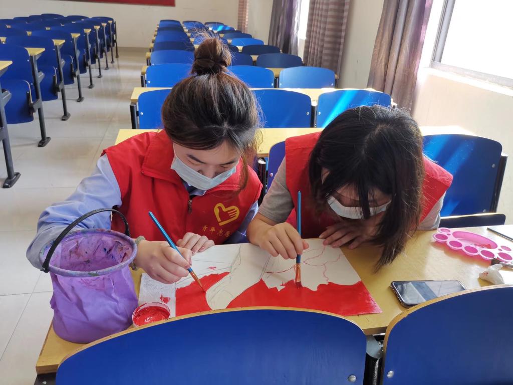 活动开始之前,志愿者们先到艺术楼集合,由负责人给大家讲述今天的活动流程。活动开始,负责人首先把绘画所需的材料分发给大家,并给大家讲述一些画画的基本技巧,之后志愿者们开始认真对照样板图上自己所分配到的部分,在画纸上进行绘画。在绘画完成之后,将所有画纸在KT板上拼接成一幅完整的作品并集中进行合影留念,活动至此圆满结束。