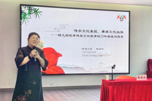 陶金玲教授围绕优秀传统文化在幼儿园课程中实践与探索展开了报告,详细讲述了幼儿园传统文化发展的价值遵循、幼儿园优秀传统文化课程建设与资源分析利用的核心要义,为与会教师在传统文化课程建设开发应用上提供了新思路,为参会员工的专业学习发展拓展了新视野。