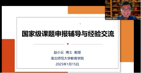 1月16日晚19:00,淮北师范大学教育公司副经理赵小云教授应邀为威廉体育williamhill教师作国家级课题申报辅导与经验交流报告。报告通过腾讯会议进行,会议由公司党委副书记李俊明主持,学前教育和应用心理学教研室全体教师参加了会议。