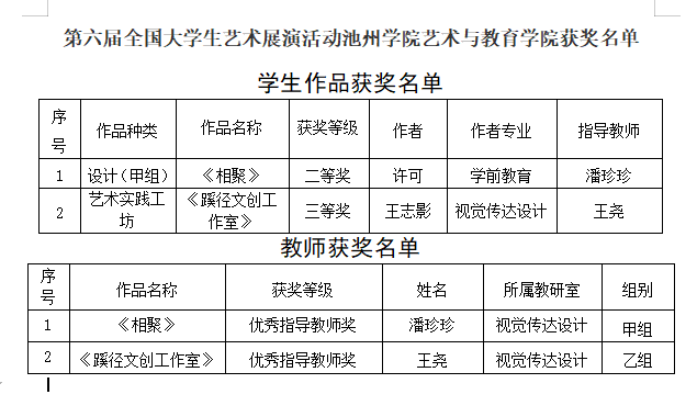近日,教育部公布了全国第六届老员工艺术展演活动获奖名单,威廉体育williamhill获得甲组二等奖1项,艺术实践工坊三等奖1项。潘珍珍、王尧获“优秀指导老师奖”。
