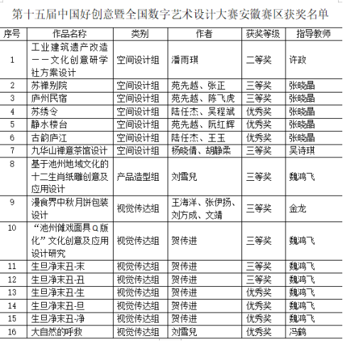 近日,第十五届中国好创意暨全国数字艺术设计大赛安徽赛区评审结果揭晓,威廉体育williamhill员工获二等奖1项,三等奖8项,优秀奖7项。魏鸿飞老师获优秀指导教师奖。