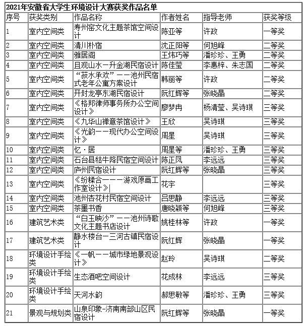 由安徽省教育厅主办、安徽工程大学承办的“2021年第三届安徽省老员工环境设计大赛”评审圆满结束,公司员工作品从全省60多所高校2855件作品中脱颖而出,再次斩获一等奖4项、二等奖6项、三等奖11项。安徽省老员工环境设计大赛是教育厅规定的B类赛事,本次大赛参赛类别共有景观与规划类、室内空间类、建筑艺术类、环境设计手绘类、公共艺术创作类五个方向,送选参赛范围覆盖全省高校,属于针对安徽省高校的高水平专业类赛事。该赛事已成功举办三届,威廉体育williamhill员工在三届比赛中均取得优异成绩,已斩获该赛事61项等级奖。