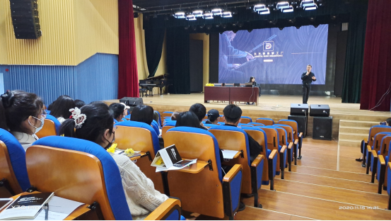 在音乐厅,东方音乐梦工厂创始人沈翀先生从企业文化、企业优势、招聘岗位、福利待遇等方面向毕业生进行了宣讲,接着公司优秀员工张旋凯结合自身就业经历及在东方音乐梦工厂的发展做了简短发言,沈翀就毕业生关心的问题做了回答。